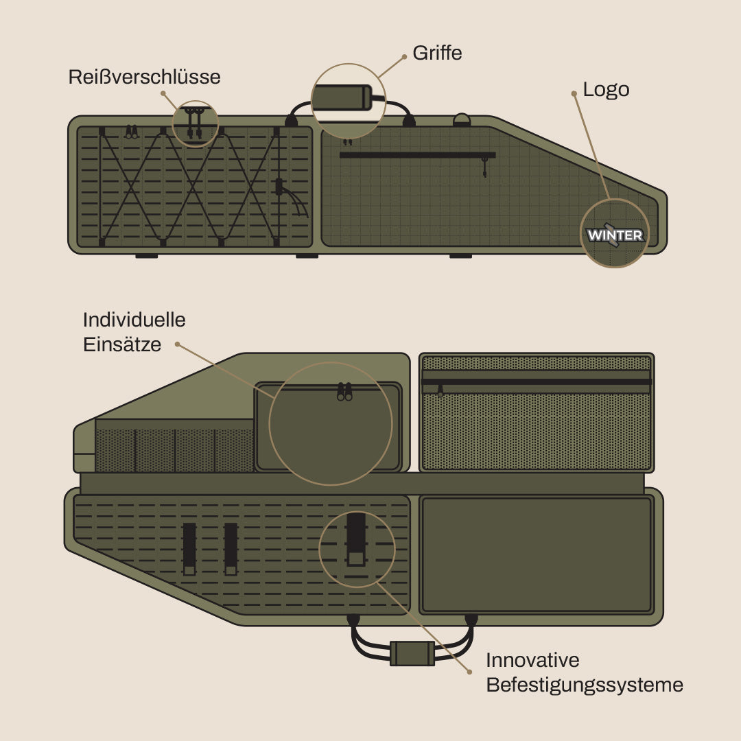 Alle unsere Winter Modelle können mit Deinem Logo und anderen Designelementen ausgestattet werden. Das spart nicht nur Entwicklungszeit, sodass du dein Produkt schneller auf den Markt bringen kannst, es fallen auch nur geringe Entwicklungs- und Werkzeugkosten an und es sind geringere MOQ's an Koffern oder Taschen möglich.